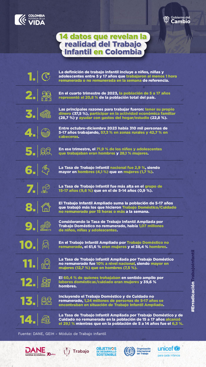 El 12 de junio, en el marco del Día Mundial contra el Trabajo Infantil, en un evento conjunto entre el Ministerio del Trabajo, la Organización Internacional del Trabajo (OIT), UNICEF y el Departamento Administrativo Nacional de Estadística (DANE), se desatacaron los cambios metodológicos en la medición del trabajo infantil a través de la Gran Encuesta Integrada de Hogares (GEIH), incluyendo el trabajo doméstico no remunerado y las actividades de cuidado.