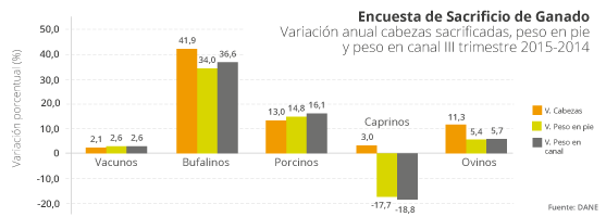 Durante el tercer trimestre de 2015 el sacrificio de ganado vacuno presentó un incremento de 2,1 % frente al mismo periodo del año anterior. Por su parte el sacrificio de bufalinos fue el que presentó el mayor crecimiento con 41,9 %. En relación a las especies menores, el sacrificio de porcinos creció 13,0 %, seguido de los ovinos y caprinos con tasas de crecimiento de 11,3 % y 3,0 % respectivamente.