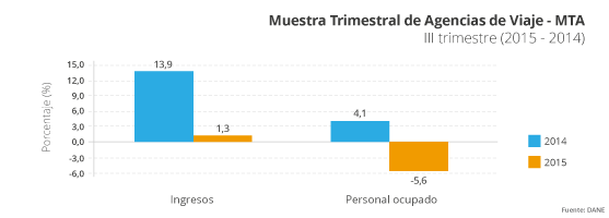 En el tercer trimestre de 2015 la Muestra Trimestral de Agencias de Viaje -MTA- mostró que los ingresos nominales de las agencias de viaje aumentaron 1,3% frente al mismo periodo de 2014, mientras que el personal ocupado disminuyó 5,6%, con relación al mismo trimestre del año anterior.