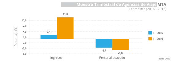 En el segundo trimestre de 2016, los ingresos nominales de las agencias de viaje aumentaron 11,8%, con relación al mismo trimestre de 2015. En el primer semestre